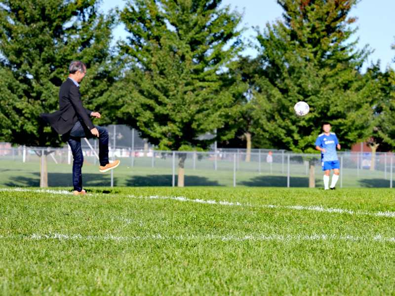 【在挑边仪式中,Michael Chan先生还为比赛投掷硬币。双方执行安省专业足球比赛的握手仪式,充满仪式感】
