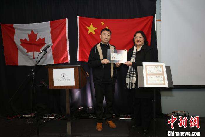 当地时间3月17日,位于白求恩家乡加拿大安大略省穆斯科卡地区的杜威白求恩医学护理学院和杜威公学举行白求恩大夫诞辰135周年纪念活动。图为著名画家、邮票设计家刘向平(左)向校方捐赠由其设计、中加两国联合发行的白求恩诞生一百周年邮票的纪念封。中新网记者余瑞冬摄