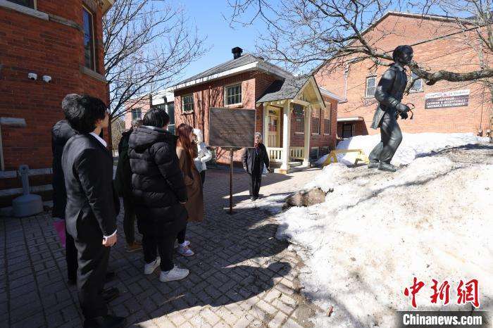 当地时间3月17日,位于白求恩家乡加拿大安大略省穆斯科卡地区的杜威(Dewey)白求恩医学护理学院和杜威公学举行白求恩大夫诞辰135周年纪念活动。图为校方师生和大多伦多地区华人社区代表在白求恩出生地穆斯科卡地区格雷文赫斯特镇参观白求恩塑像。中新网记者余瑞冬摄