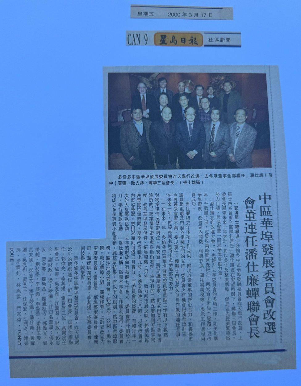 (2000年3月17日,《星岛日报》刊登了关于“多伦多中区华埠发展委员会”换届选举的报道。图为新一届董事会成员合影。同年8月,在该委员会推动下,首届“多伦多中区华埠同乐日”诞生,为中区唐人街注入新活力。)