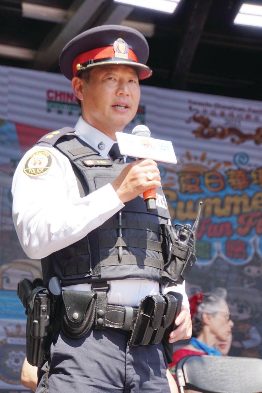 (在开幕式上,多伦多警察局14分局督察Robert Choe发言。他回忆了童年随母亲常来唐人街的记忆,并表示如今作为安保负责人,能守护这片承载着跨族裔共同记忆的社区舞台,别具意义。)