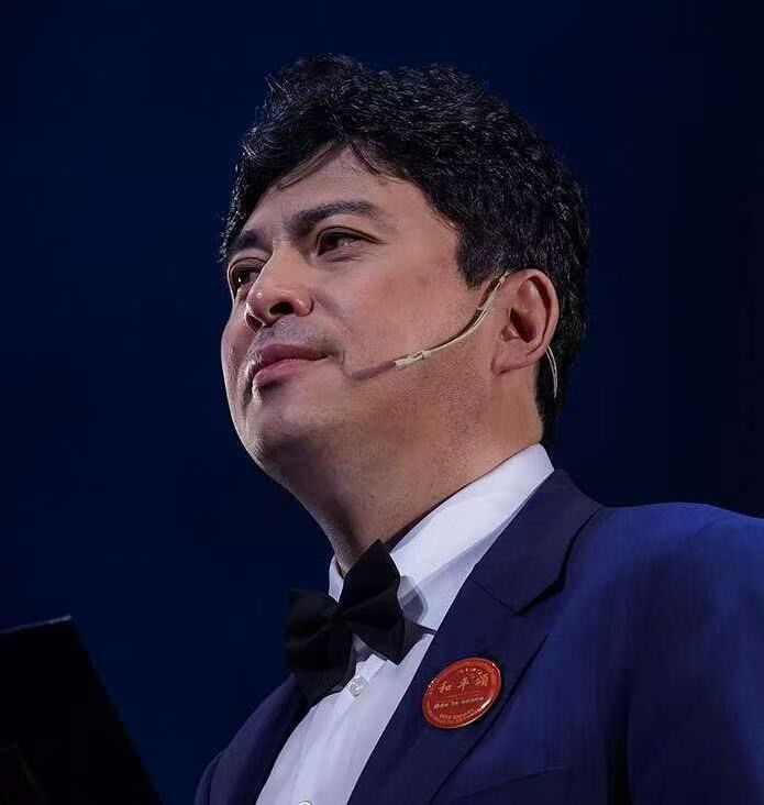 (2025年新版《和平颂》演出现场,总导演张炜在《黄河大合唱》中担纲朗诵表演。他在2015年首次参与《和平颂》时,并无朗诵基础,却凭借对艺术的热爱、对作品情感的深刻理解以及出色的领悟力,成功完成这项极具挑战的表演任务。)