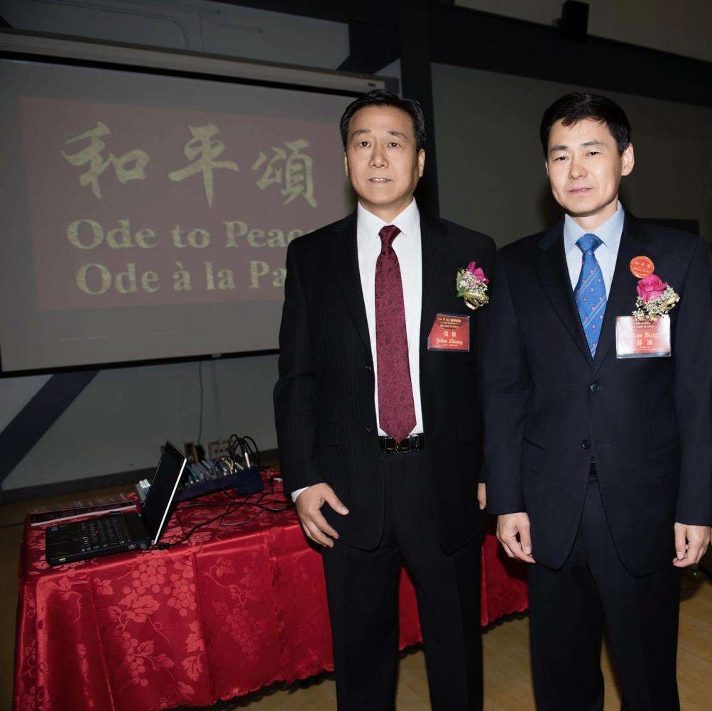 (图为时任中国驻多伦多总领馆总领事薛冰在现场观看2015年第一届《和平颂》演出后,与组委会主席张俭合影,表达对该系列纪念活动的支持与肯定。)