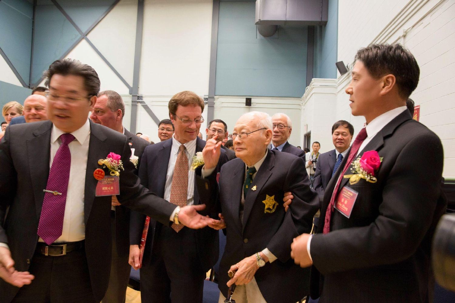 (图为国军老兵范孟襄【中】,在组委会共同主席欧阳元森【左】与张俭【右】的陪同下缓步走入剧场。虽已年逾九旬,范老精神矍铄、目光坚毅,让人肃然起敬。)