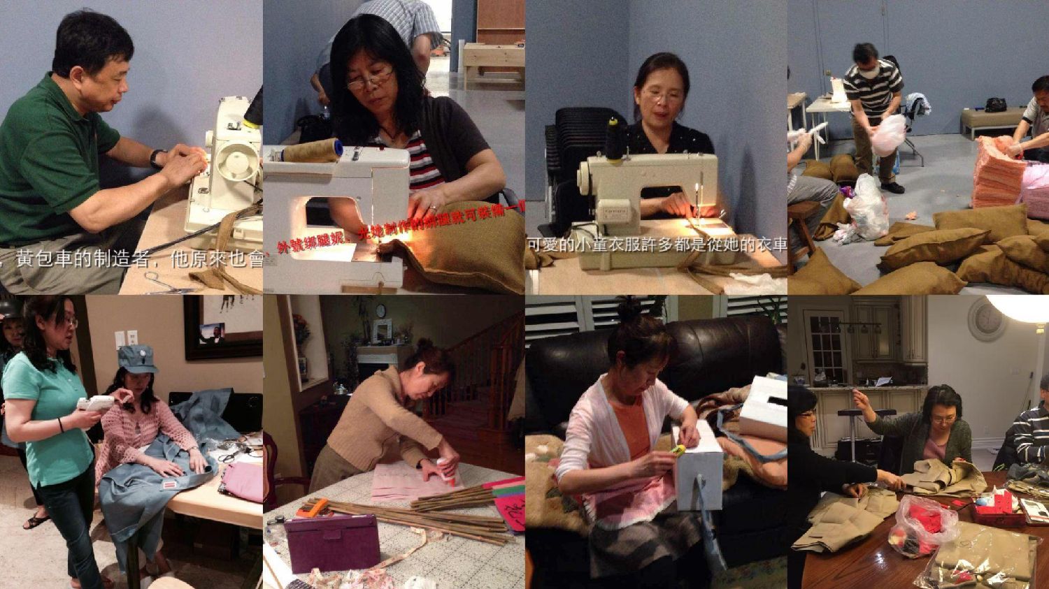 同样为这场演出的服装道具制作默默付出,做出重要贡献的,还有另一对义工夫妇——牟伦俊与刘妮。他们都是科研工作者,牟伦俊拥有统计遗传学博士学位,刘妮则在安大略癌症研究所工作多年,直至退休。2015年《和平颂》演出中,战士们表演中所穿的“绑腿”道具,绝大部分都是他们一针一线缝制出来的,其中,刘妮亲手缝制了150多条“绑腿”,不仅数量多,而且质量也做的非常好,所以大家给她取了一个亲切的外号叫“绑腿妮”。