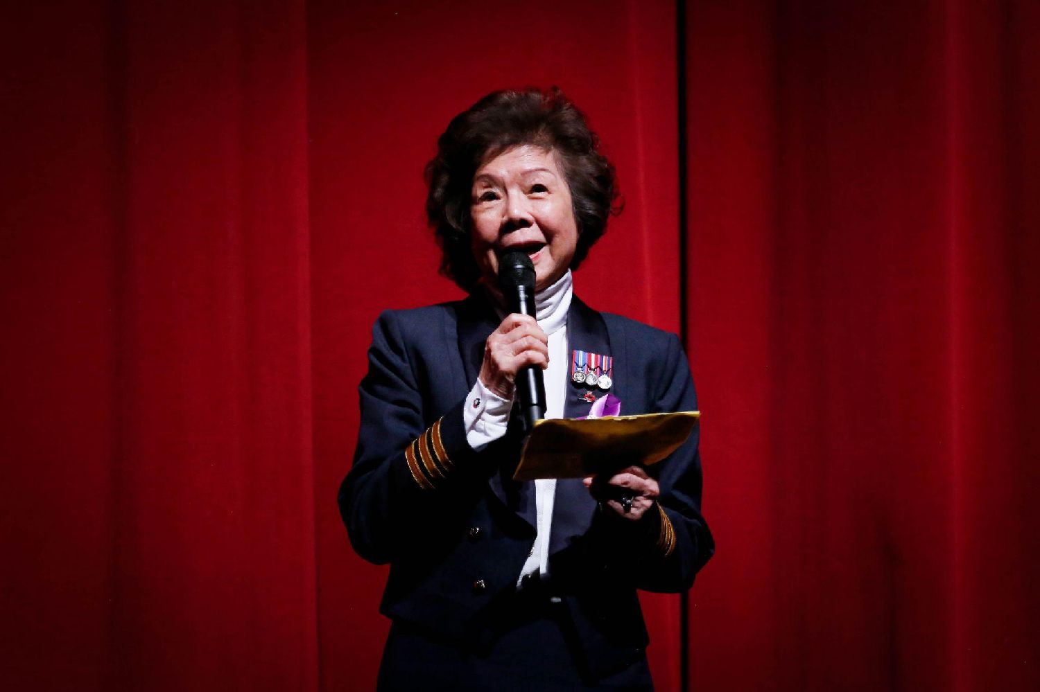 (加拿大前公民法官、退役荣誉中校萧美珍(Nancy Siew)在2025年《和平颂》演出现场致辞。她表示,演出通过音乐与影像艺术生动再现抗战历史,让人深刻体会到战争的残酷与和平的来之不易。她认为,《和平颂》不仅是一次艺术呈现,更是一堂铭记历史、珍视和平的精神教育。)