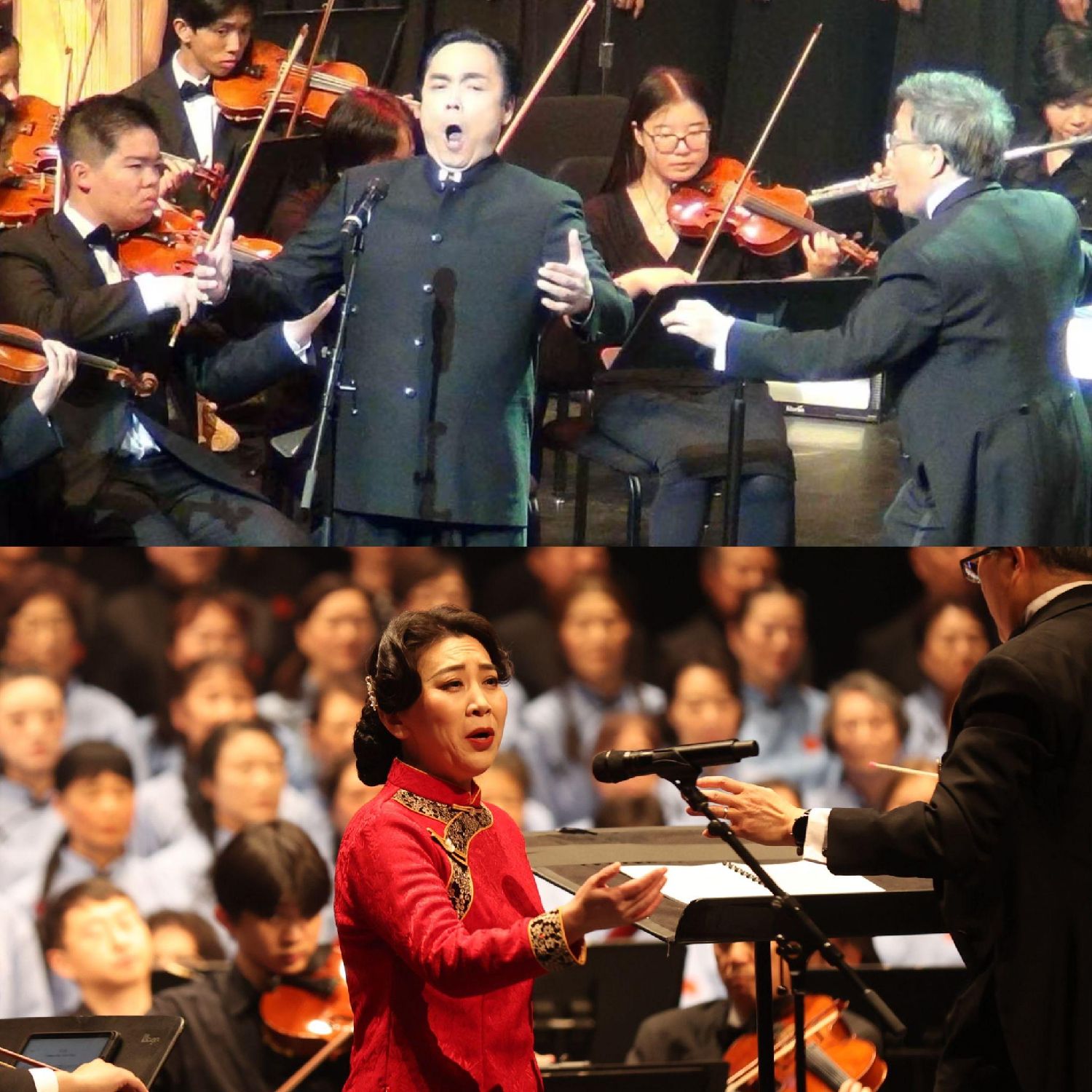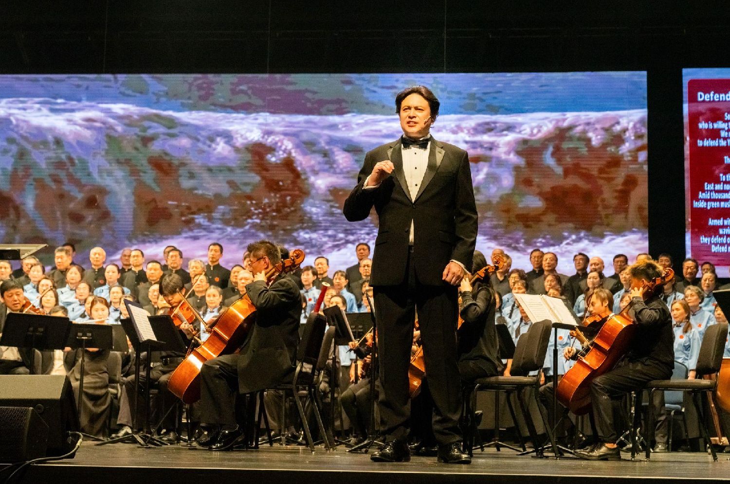 (《黄河大合唱》演出中,男声独唱《黄河颂》由武云(Wu Yun)担任,他曾在2015年演出中出演该角色,2025年再次登台,唱腔更显沉稳大气;女声独唱《黄河怨》由首次参演《和平颂》的何春威(Vicky He)担纲,其清亮细腻、富有感染力的嗓音赢得全场共鸣。)