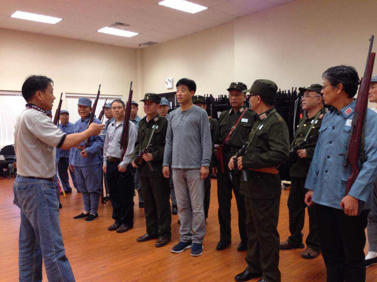 (图为2015年《和平颂》首演排练期间,张俭(左一)为男声小合唱《旗正飘飘》亲自指导排练,参演者身着抗战时期服装,认真听取指令,力求还原历史场景。)