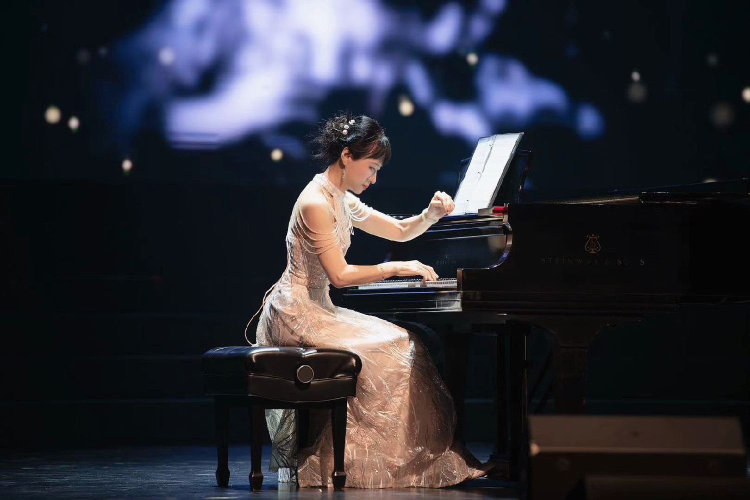 (图为钢琴教育家韩丽在2025第二届《和平颂》第四幕《辛德勒的名单》中的 现场演奏。前奏改编及引子创作由她亲自完成,音乐张力十足,广受观众好评。)