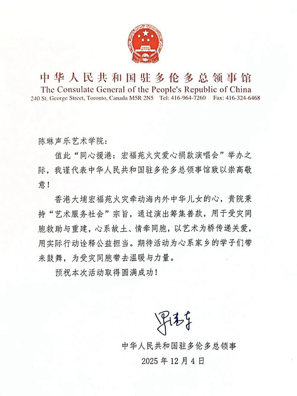 多伦多当地时间12月7日,一场名为“同心援港”的爱心捐款马拉松演唱会在万锦市小红馆温暖落幕。本次活动收到了中国驻多伦多总领事馆发来的贺信,对活动表达了崇高的敬意与祝福。演唱会由著名女高音歌唱家陈琳老师及其创办的”多伦多陈琳声乐艺术学院”发起,旨在为香港大埔宏福苑火灾受灾同胞筹集善款。在长达六小时的演出中,近百名表演者接力呈现了70个动人节目。活动最终成功筹得善款27,500加元,所有款项将全额汇入香港特区政府设立的专项基金。