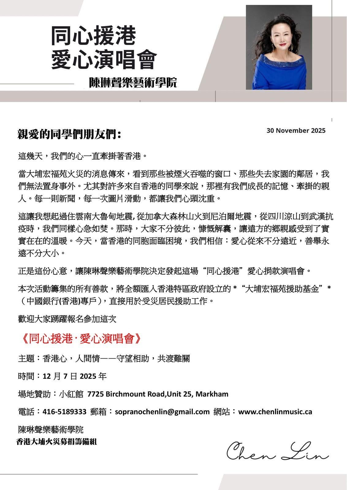 本次援港演唱会,是陈琳声乐艺术学院自2010年成立以来“艺术服务社会”理念的又一次生动实践。十五年间,学院已成功举办十多场大型筹款活动,累计筹款超过25万加元,爱心足迹跨越国界,支援包括云南鲁甸地震、武汉火神山医院、尼泊尔大地震及加拿大森林火灾等多个灾区,并长期服务本地社区老人院、支持四川大凉山及加拿大原住民教育项目。正是这份长达十五年的公益坚守,为本次活动的迅速发起和广泛信任奠定了坚定基础。