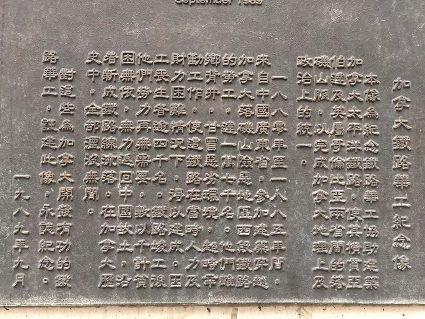 “铁路华工纪念碑”是由加拿大联邦政府文化部、安省政府和多伦多市政府拨款,在纪念加拿大铁路华工基金会的积极推动和社会各界共同参与下,于1989年9月24日举行揭幕典礼。位于多伦多的铁路华工纪念碑是加拿大已建铁路华工纪念碑中最壮观的一座,并成为多伦多的标志性建筑及旅游景观。 这座为纪念连接加拿大的无声拓荒者而修建的铁路华工纪念碑,对所有加拿大人来说都很重要。它可以帮助华裔加拿大人理解自己的前辈曾经是加拿大历史的一部分,纪念成千上万籍籍无名的华工对加拿大最重要的国家建设项目之一——第一条穿越落基山脉的铁路所做的贡献,这些贡献常常被忽视。铁路竣工后,许多幸存的华工无法找到新工作。这些华工继续面临歧视,他们贫困无依,无力返乡。许多人一无所有,沿着新建成的铁路线流落漂泊。