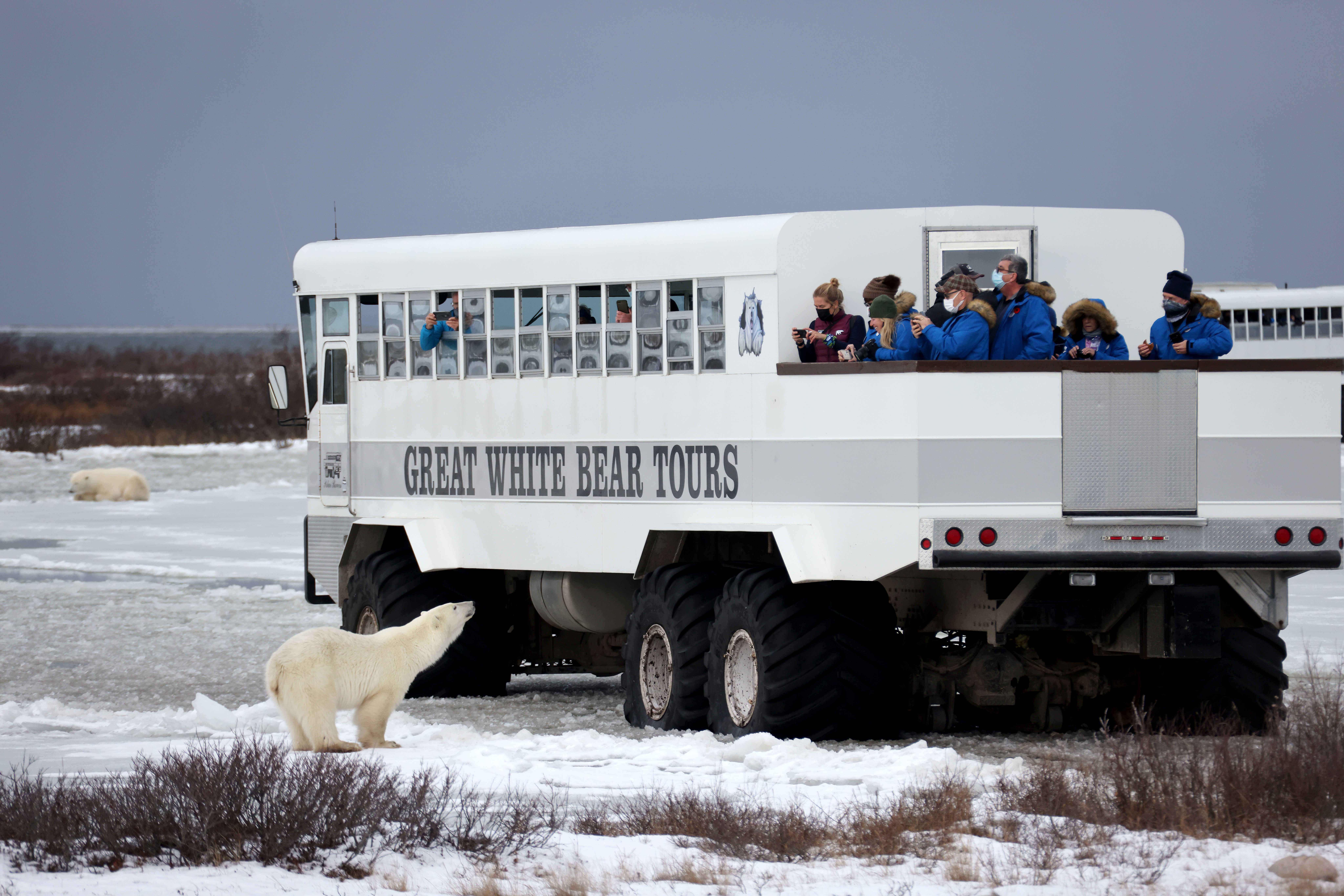 因此,11月上旬会成为北极熊最常出没的季节。世界各地的探险者、观光客纷至沓来。北极熊令旅游业成为丘吉尔镇的经济支柱。人们乘坐有着巨大轮胎的特制苔原车,进入北极熊的栖息区域,带着兴奋与熊“邂逅”。