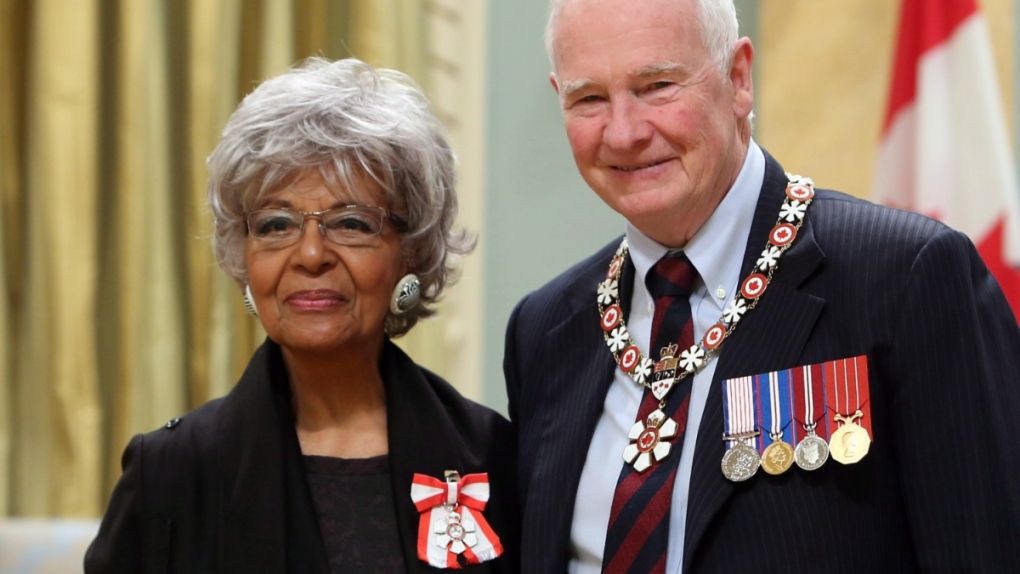 2014年11月21日,卑诗省萨里市的埃莉诺·柯林斯(Eleanor Collins)与总督戴维·约翰斯顿(David Johnston)在里多厅(Rideau Hall)举行的仪式上被授予加拿大勋章成员时合影。