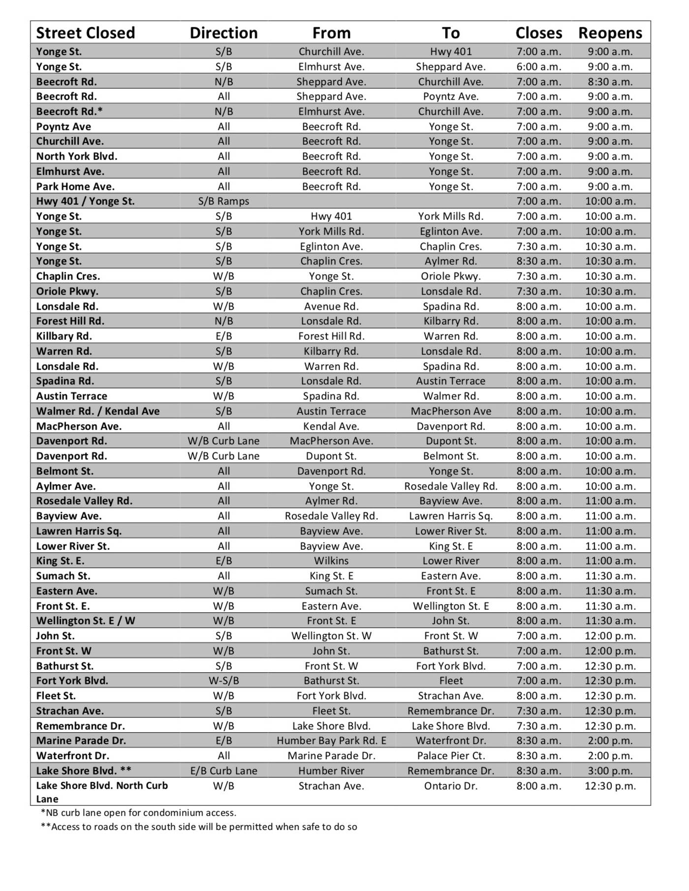 多伦多马拉松筹委会将与市政府官员密切合作,以尽量减少干扰并尽快重新开放道路。多伦多警方将在主要十字路口指挥交通。预计会有一些延误。
