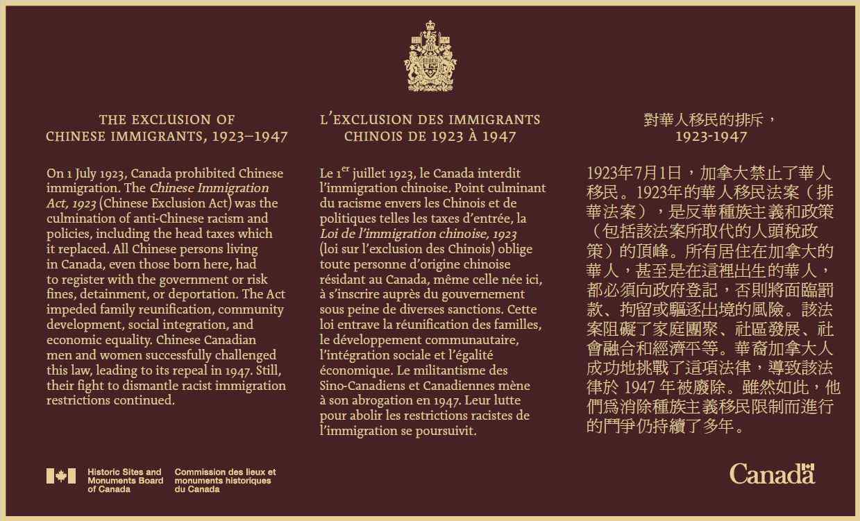 “在1923年至1947年间排斥华人移民的做法是加拿大历史上一个以制度化种族主义为标志的悲惨时代。这块牌匾承认了华裔加拿大人在《排华法案》的限制下所遭受的苦难,同时也认可了他们在挑战这项立法时的勇敢和坚韧。”