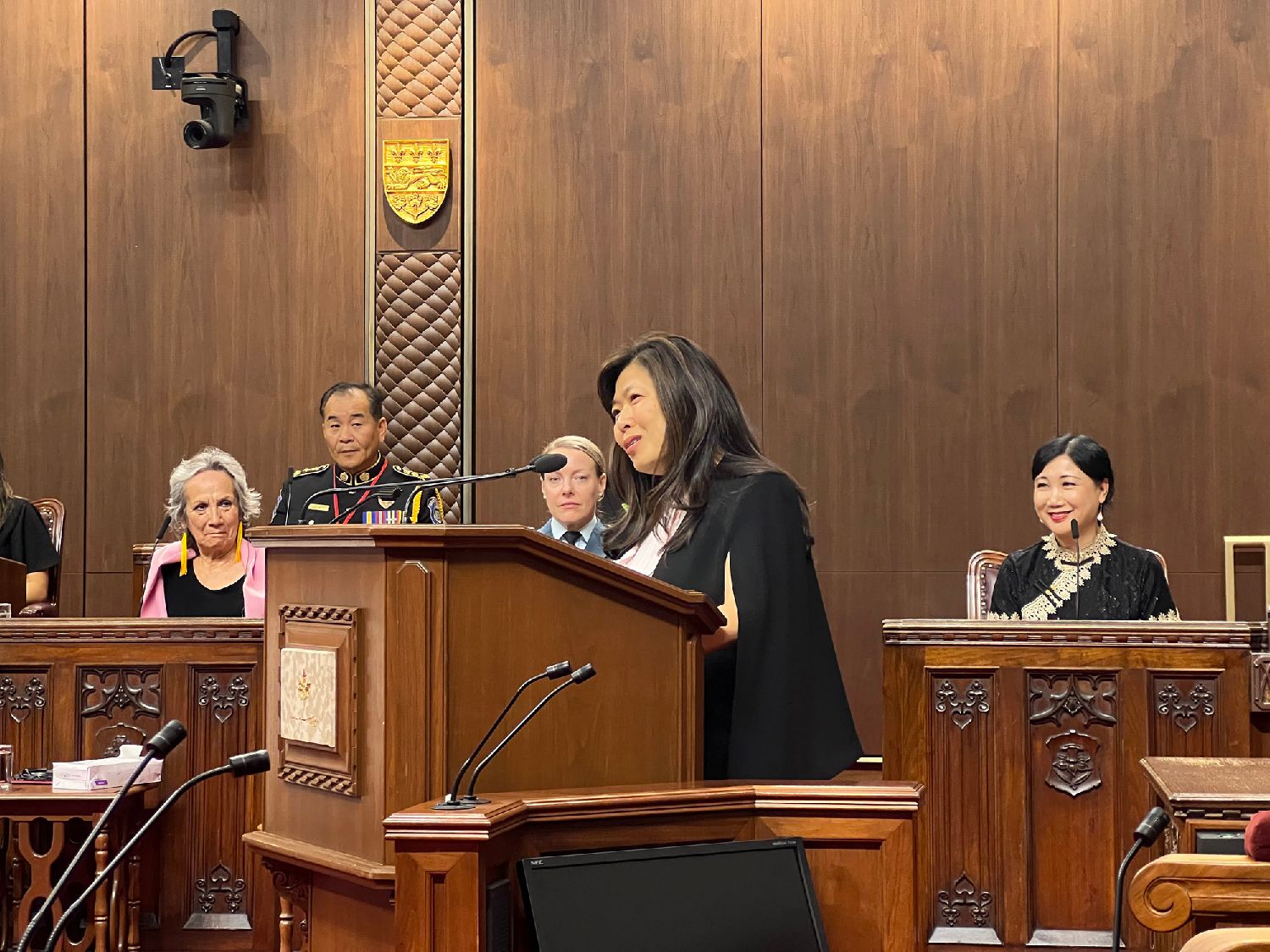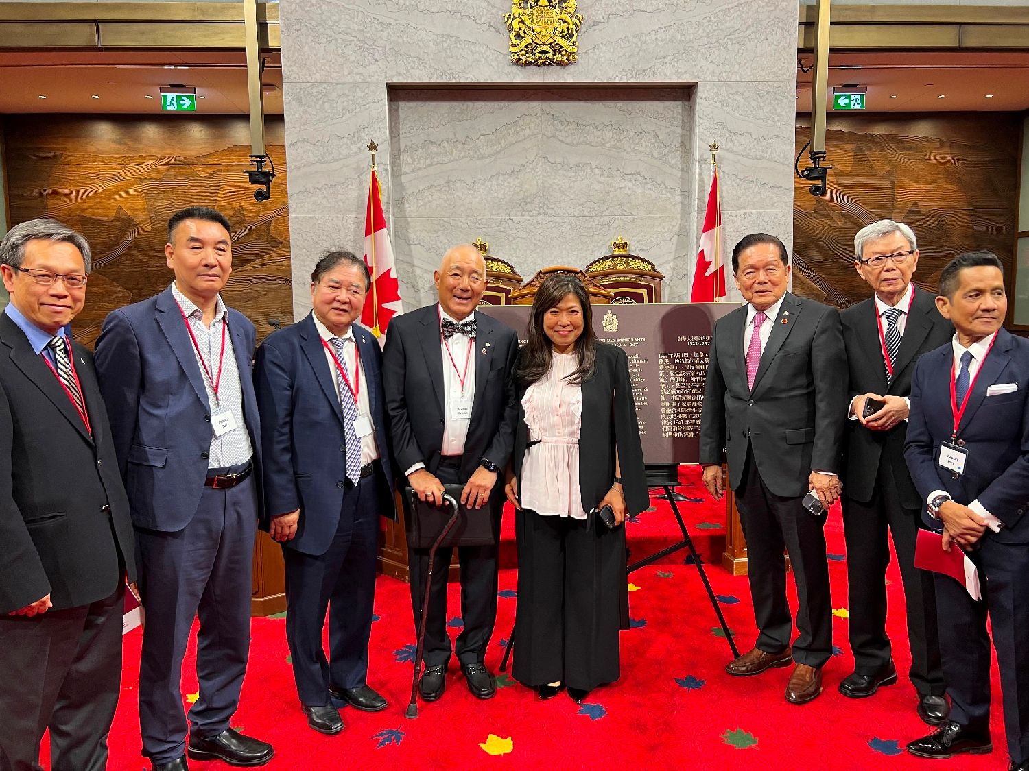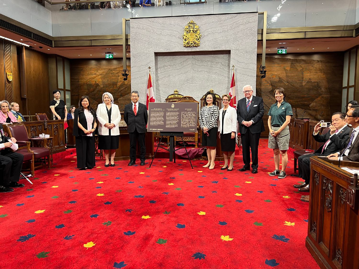 (在加拿大参议院,在加拿大总督、参议员和众多华裔加拿大人的见证下,伍凤仪部长代表吉保尔部长和加拿大政府为纪念牌匾揭幕,这块牌匾最终将摆放在温哥华历史悠久的唐人街新的加拿大华裔博物馆)