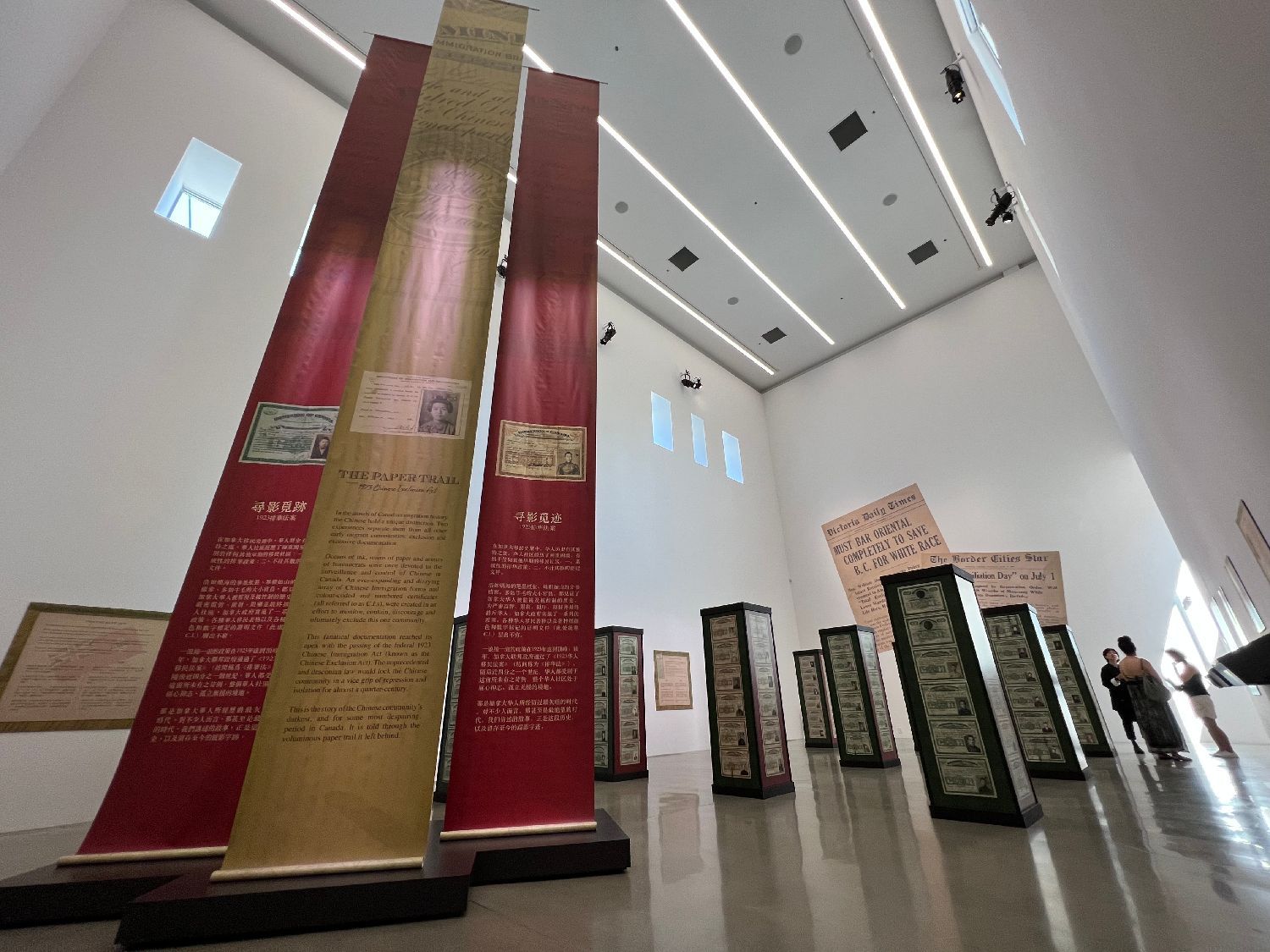 二楼是主题展《寻影觅迹》,展览出的历史资料、档案带入感强,渐进式地展示了主流社会在历史上对华人的恶意歧视,从征收人头税,到《排华法案》的通过,以及该苛律对华人造成无法愈合的严重创伤。展览收集了大量当时颁发给针对华人的特殊身份证件,排斥华人的文章报导。一张图片生动记录了这场人为的时代灾难对华人的蹂躏。