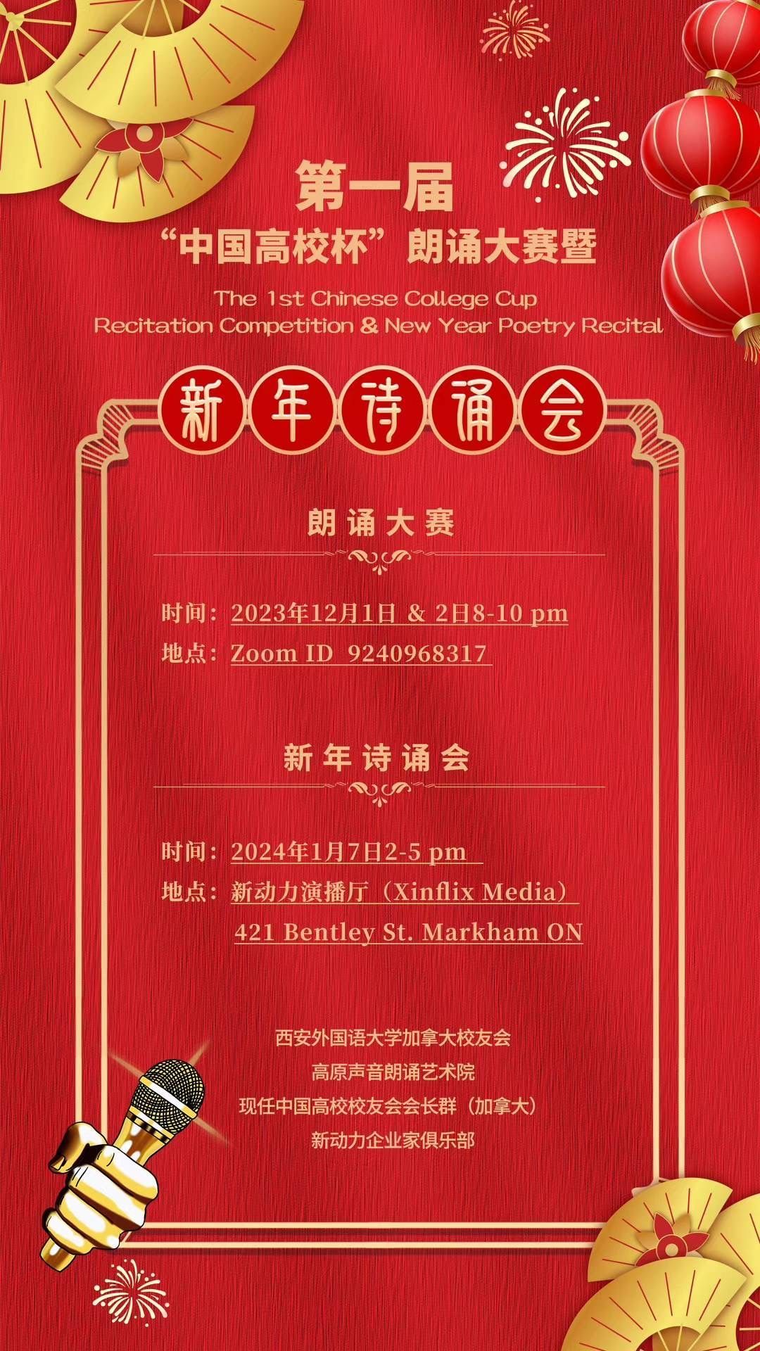 朗诵,作为抒发情感,陶冶情操和最具亲和力的一种艺术形式正在广泛地走入人们的生活中。为了提高朗诵和欣赏水平,陶冶情操,由西安外国语大学加拿大校友会、高原声音朗诵艺术院、现任中国高校校友会会长群和新动力企业家俱乐部联合发起了第一届“中国高校杯”朗诵大赛。