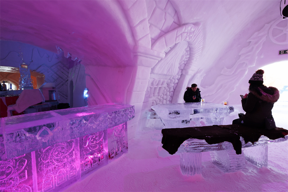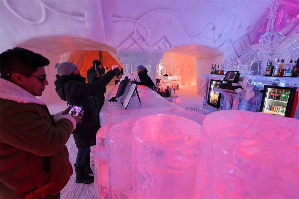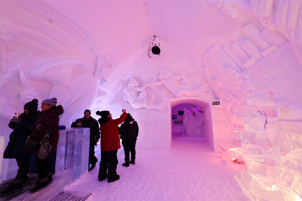 2月5日,游客在加拿大魁北克省首府魁北克市附近的冰旅馆(Hôtel de Glace)参观,体验当地冰雪旅游文化。这是北美唯一一间全部用冰和雪建造的酒店,每年冬天仅1月中旬至3月中旬开放。