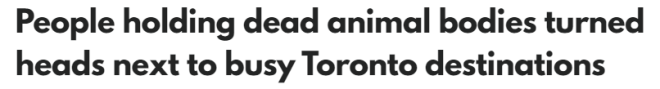 周日,一群人在多伦多街头怀抱动物尸体抗议,引发大批路过的人驻足观看。
