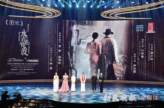 仪式的最后,中国导演管虎、演员黄渤共同揭晓开幕影片《永不消逝的电波》。他们动情地说:“这是一个由舞蹈演绎的动人故事,也是一个历久弥新、永不消逝的故事。”这部聚焦隐蔽战线上革命先烈在上海英勇奋斗的舞剧电影,融合光影与舞台艺术,书写历史,传承红色血脉。舞剧电影《永不消逝的电波》导演郑大圣与主演王佳俊、朱洁静也共同上台。郑大圣说,自己出生、长大在上海,家族里也有很多人是从事戏剧和电影工作的,“许多人为了这座城市的光荣与梦想,付出了青春和热血。这些革命者的故事和英雄传奇,值得一代又一代人去诉说,去传颂,去重新演绎。我们尝试在戏剧和电影之间寻找一些新的可能性。希望得到大家的指正。”演员朱洁静说:“无论是影视演员还是舞剧演员,虽然前缀不同,但我们都是‘演员’。作为舞剧演员,我们有一颗真挚的心,想要毫无保留地把自己的一切能量交给舞台,也相信舞台会给我们帮助和答案。”两位演员在现场演绎了同名舞剧片段,绵长而热烈的掌声,盛满了感动。97岁的李康将当年收到李白烈士生前发出的最后一封电报,她虽然没能来到现场,但她说:“今天电影要放映了,我很高兴,我想用发电报的方式告诉李白:敬爱的李白同志,我们很想念你,很想念你。”