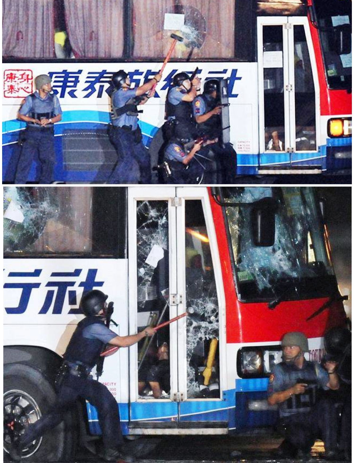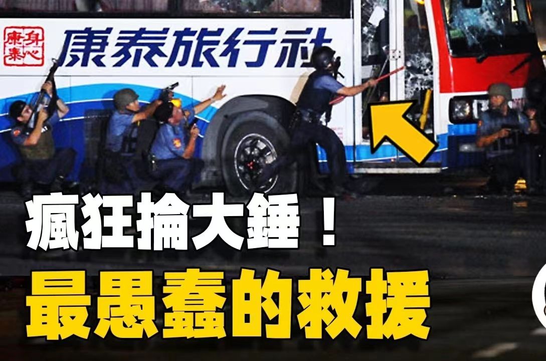 首先,菲律宾特警靠向大巴挥起铁锤砸车窗玻璃,砸了后面又砸前面;砸了车门砸风挡,顺便连车灯也砸了;乒乒乓乓的抡大锤中没把车窗砸开,反而把车内一名人质砸成重伤!
