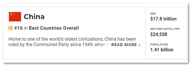 中国从第20位升至第16,与日本同为前25名中升幅最大的国家。中国在国力和未来能动性类别中排行第2,在出口强劲程度排行第1,军力排行第4。