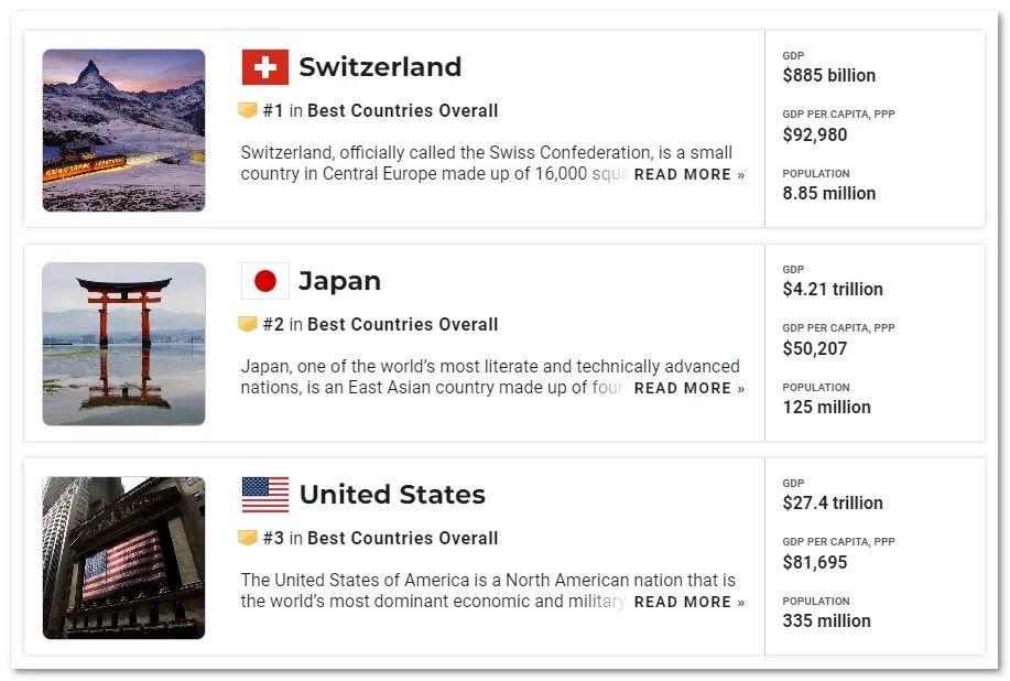 瑞士自2017年以来,已经七次登顶最佳国家排名,其在商业开放度、生活质量和创业环境等领域的出色表现尤其突出。日本凭借在商业、进步者和冒险类别的提升,排名上升至第二位。美国则升至第三位,这是其历史上的最佳排名。