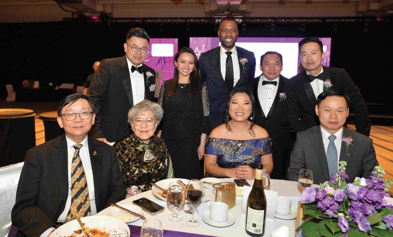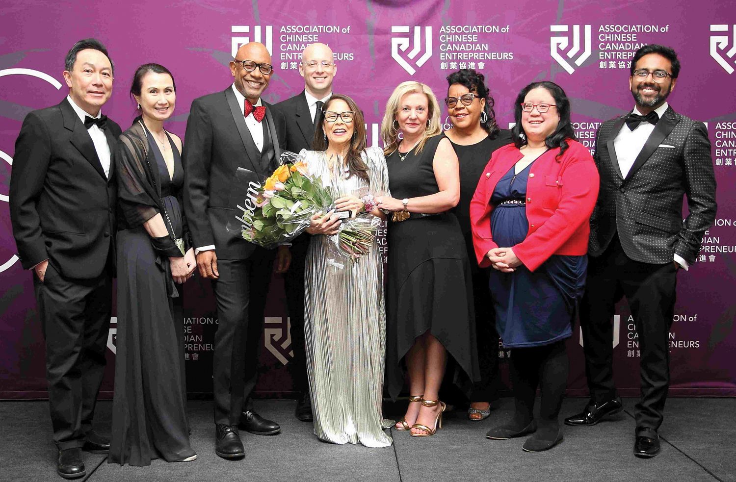 共同主席(左5,中)與得獎者合影,左起最佳國際商業獎:Uken Games–葉聖佳;最佳亞太貿易獎:MTI–金偉強;最佳企業進步獎:Aplin&Martin Consultants Ltd.-陳日輝;最佳企業家獎:Western Coast Enterprise Ltd.–糜閱;終身成就獎:Donette Chin-Loy Chang博士;最佳社區服務獎:Catalyst Agents–梁鳳麟;最佳企業創辦獎:SIHE International Group四合喜悅國際集團有限公司–冼穎;最佳創意獎:GPTzero–崔宇豪;傑出青年創業獎:Mimigo–譚柏亮。