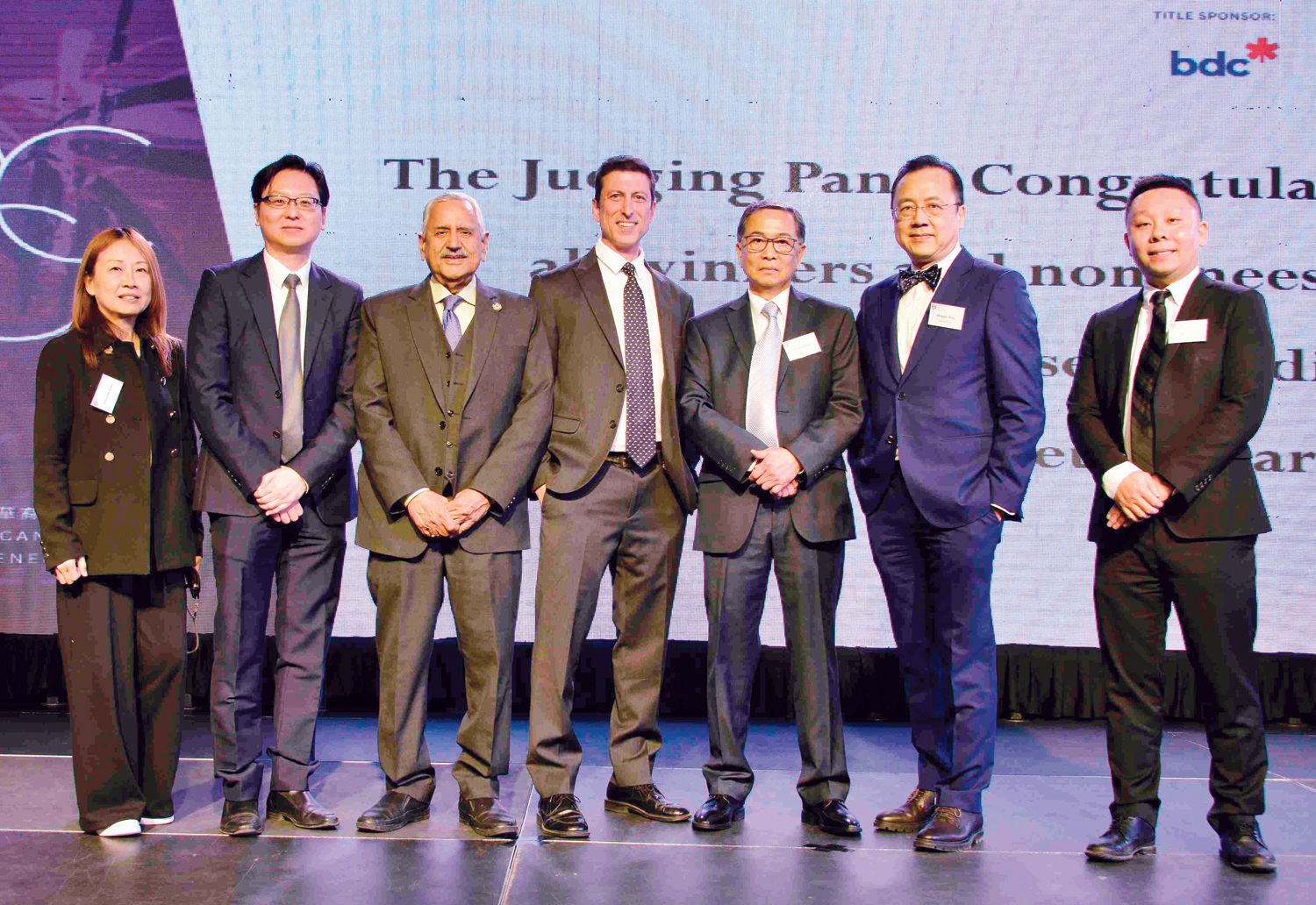 獨立評選團成員合照:左起Christine Lam(加拿大普華永道)、Arthur Chan(安永會計師行)、Lalit Guglani(百年紀念學院)、Sean Stanleigh(環球郵報)、Vernier Tao(安省)和Dennis Woo(畢馬威會計師事務所)和Hanson Li。