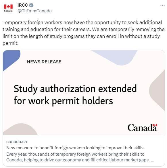 6月27日,加拿大移民局最新宣布临时政策:工签持有人可在加拿大学习,取消课程时长限制!